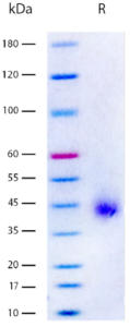 | Determined by an inhibition of adipogenesis differentiation using 3T3-L1 cells. There is >40% inhibition of differentiation as measured by Oil Red O staining with 10-100 ng/mL sDLK-1 treatment. | Recombinant Human sDLK-1 (2 μg/lane) on SDS-PAGE under reducing (R) conditions. The gel was stained using Coomassie® Blue showing a single band around 40-45 kDa, and purity greater than 98%. |