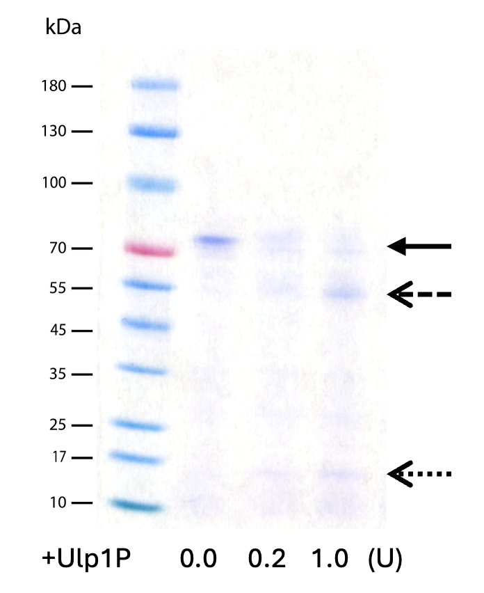| Biological Activity | SUMO protease Ulp1p is highly specific for cleaving SUMO protein fusions. It exhibits both high activity and specificity, making it a preferred choice for cleaving SUMO tags independently of the target protein’s structure, leaving no additional amino acids at the N-terminus of the target protein. Specific activity is > 1×10^5 Units/mg. One unit of SUMO Protease Ulp1p is the amount of enzyme required to cleave >90% of 20 µg of SUMO-tag fused protein at 30°C in one hour. |